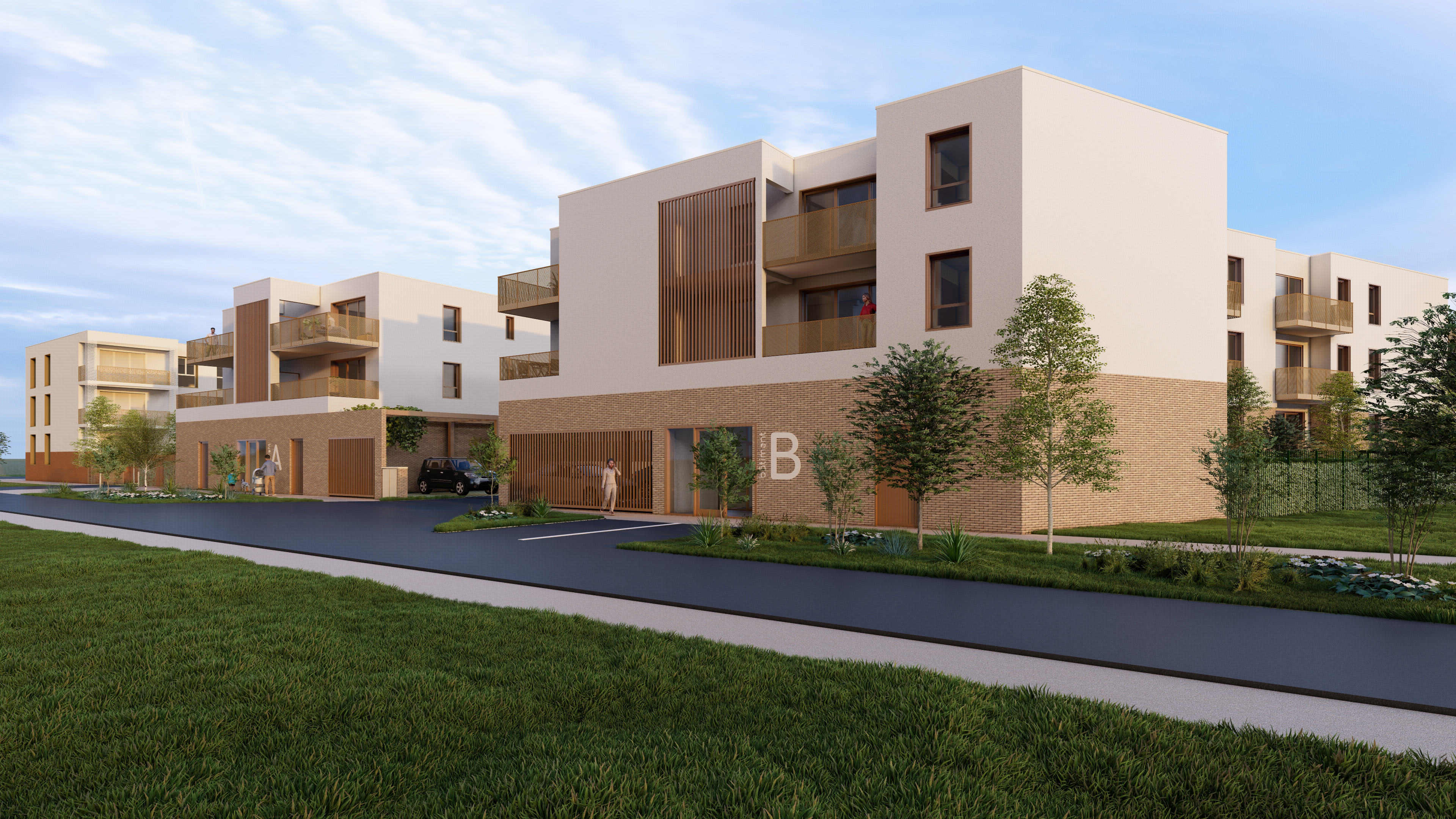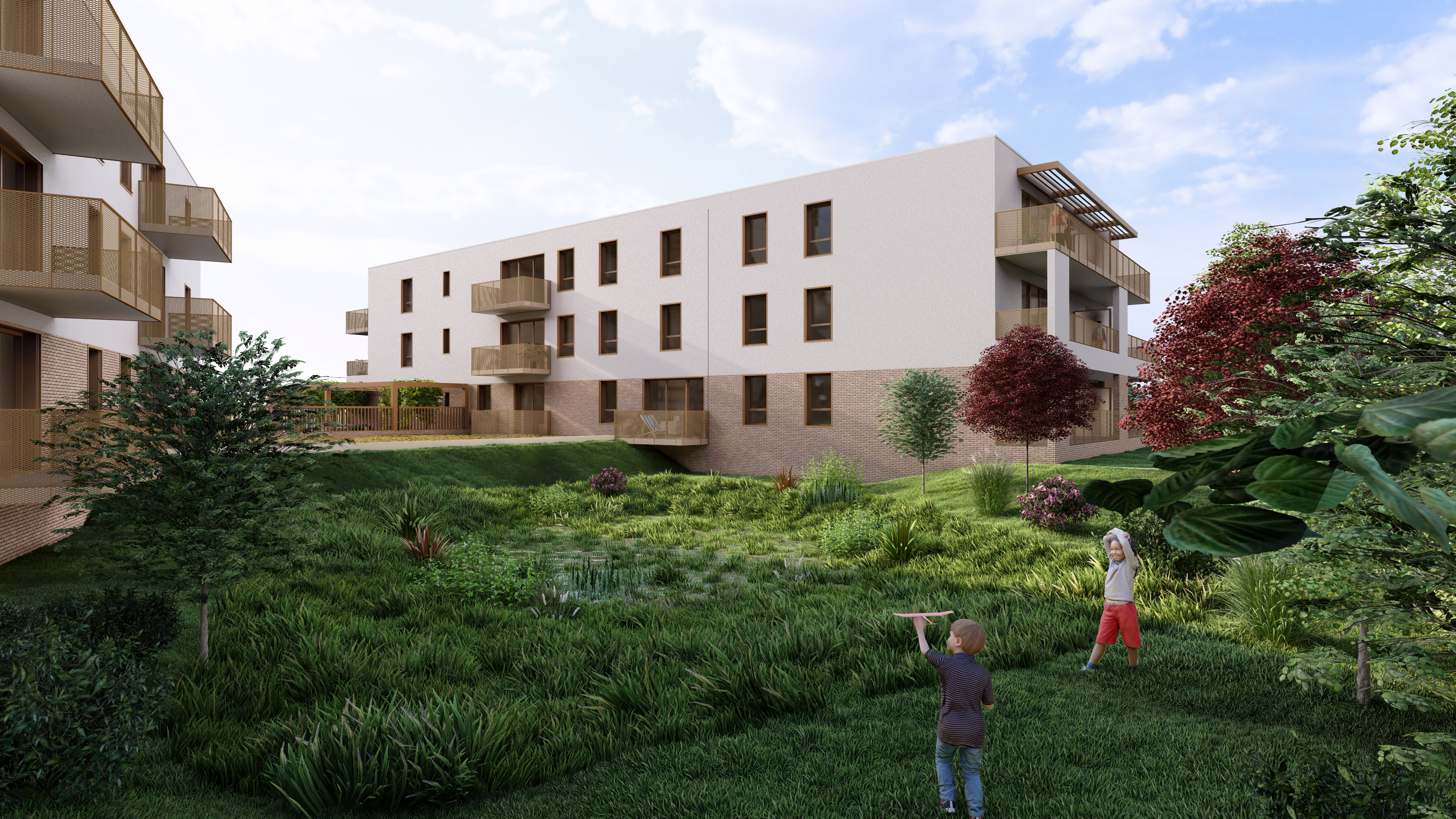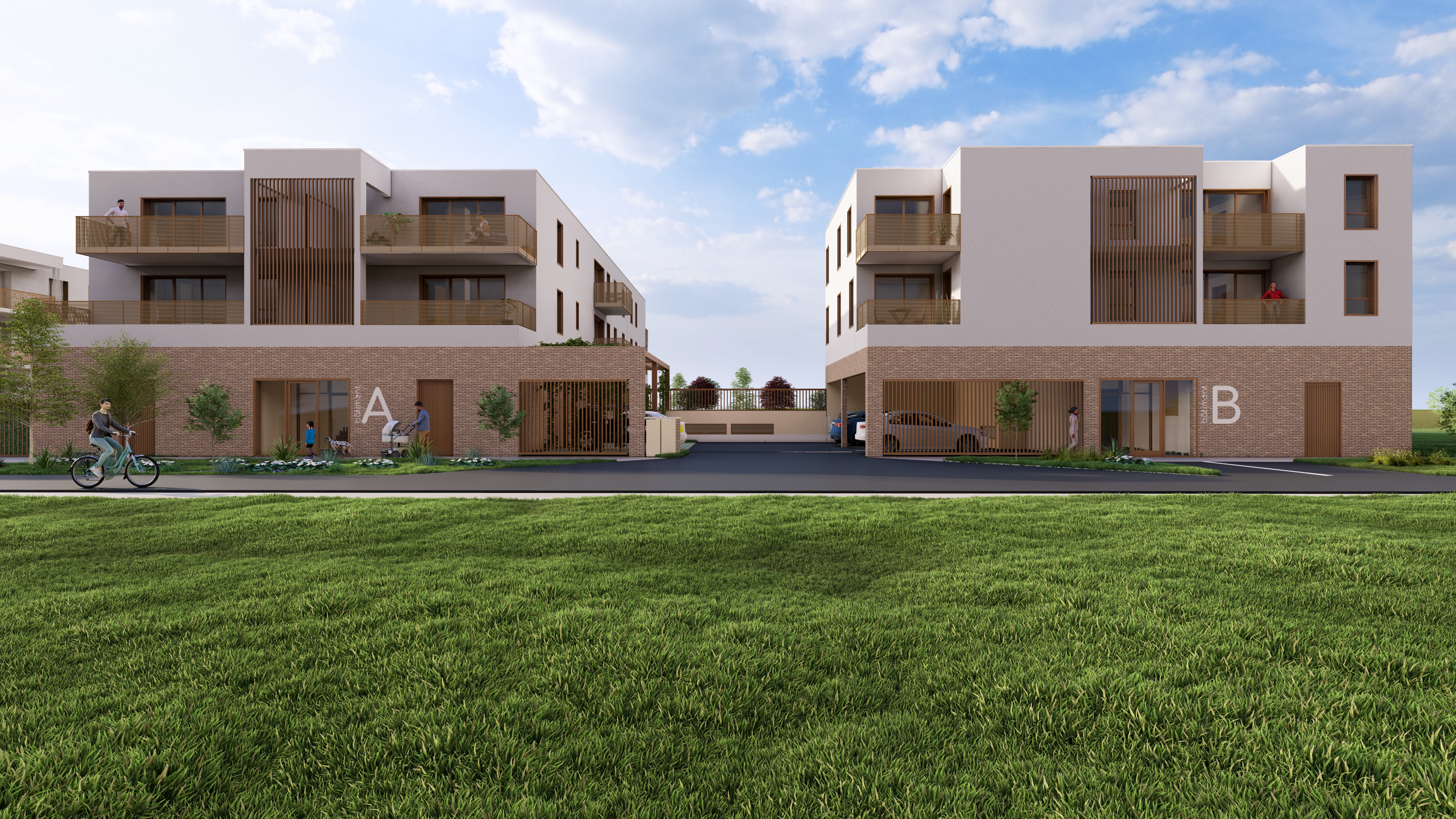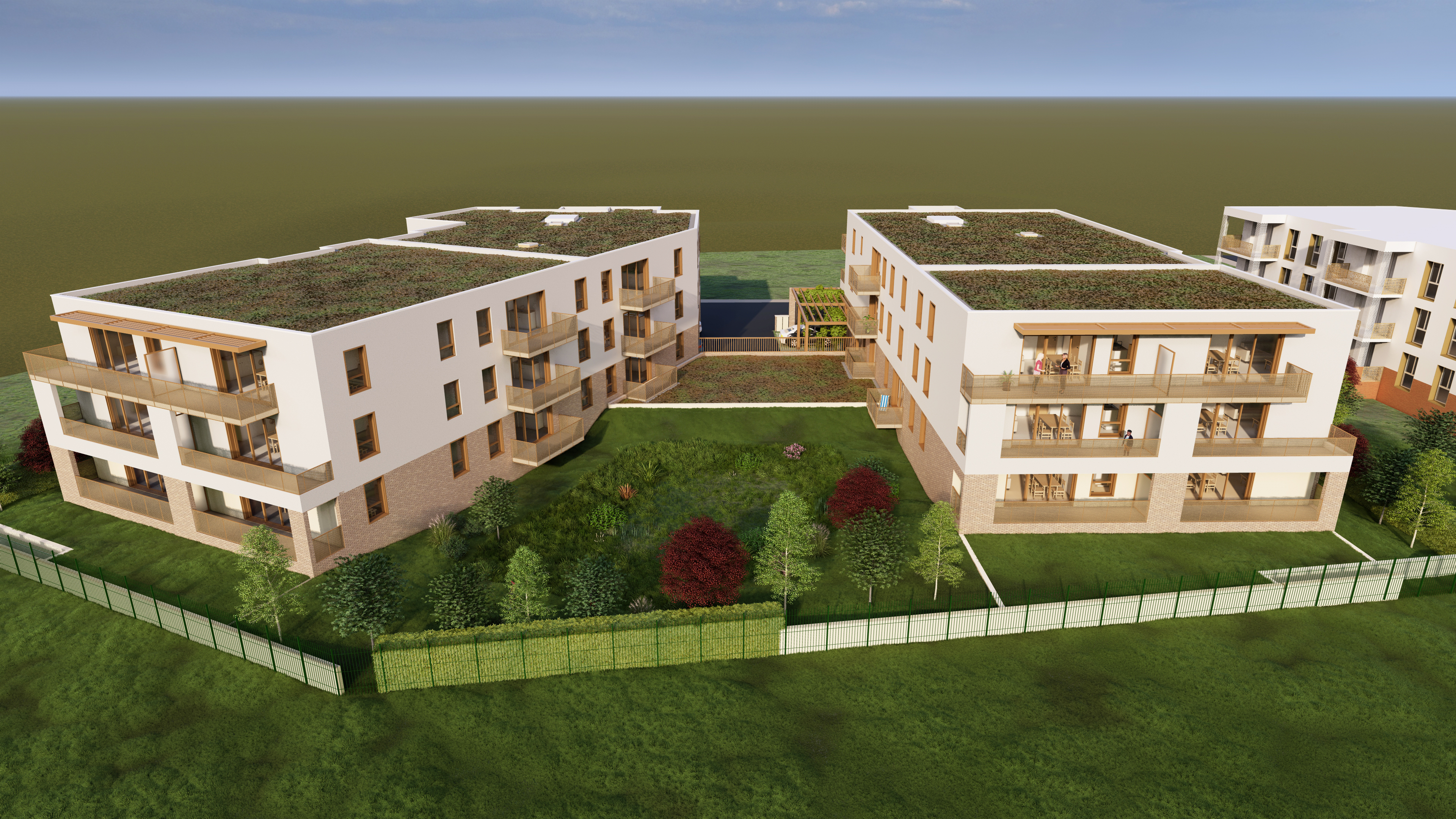 Toiture végétalisée sur l’ensemble du projet, espaces verts généreux. Locaux vélos intégrés aux bâtiments. Chaque logement dispose d’un espace extérieur.