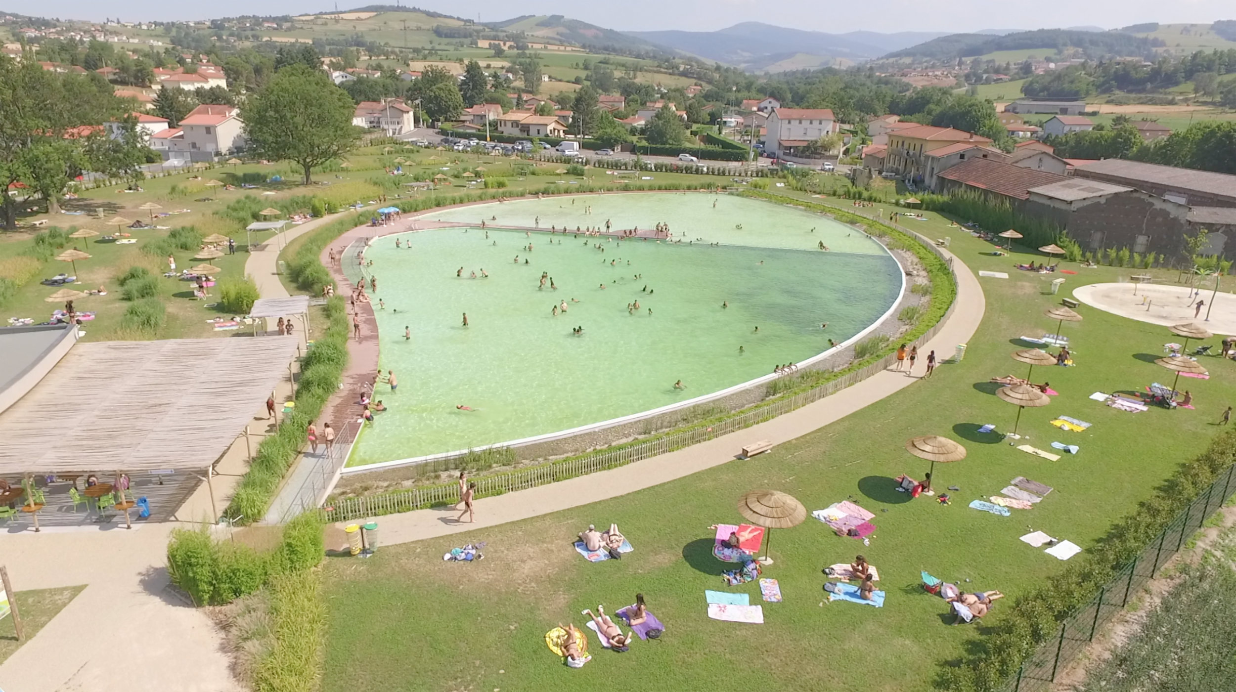 Les trois bains sont au centre de la composition et permettent de delimiter trois espaces tres distincts pour trois classes dages. Laménagement d'un grand ponton en bois comme élément central permet une parfaite distribution des différents espaces et des différents usagers. Des jardins aquatiques ont ete aménagés en contrebas des bassins. Un grand miroir d'eau sur les bassins et une longue lame d'eau dans les jardins aquatiques, constituant un point visuel trés fort et une promenade botanique agréable, ont ainsi ete crées.