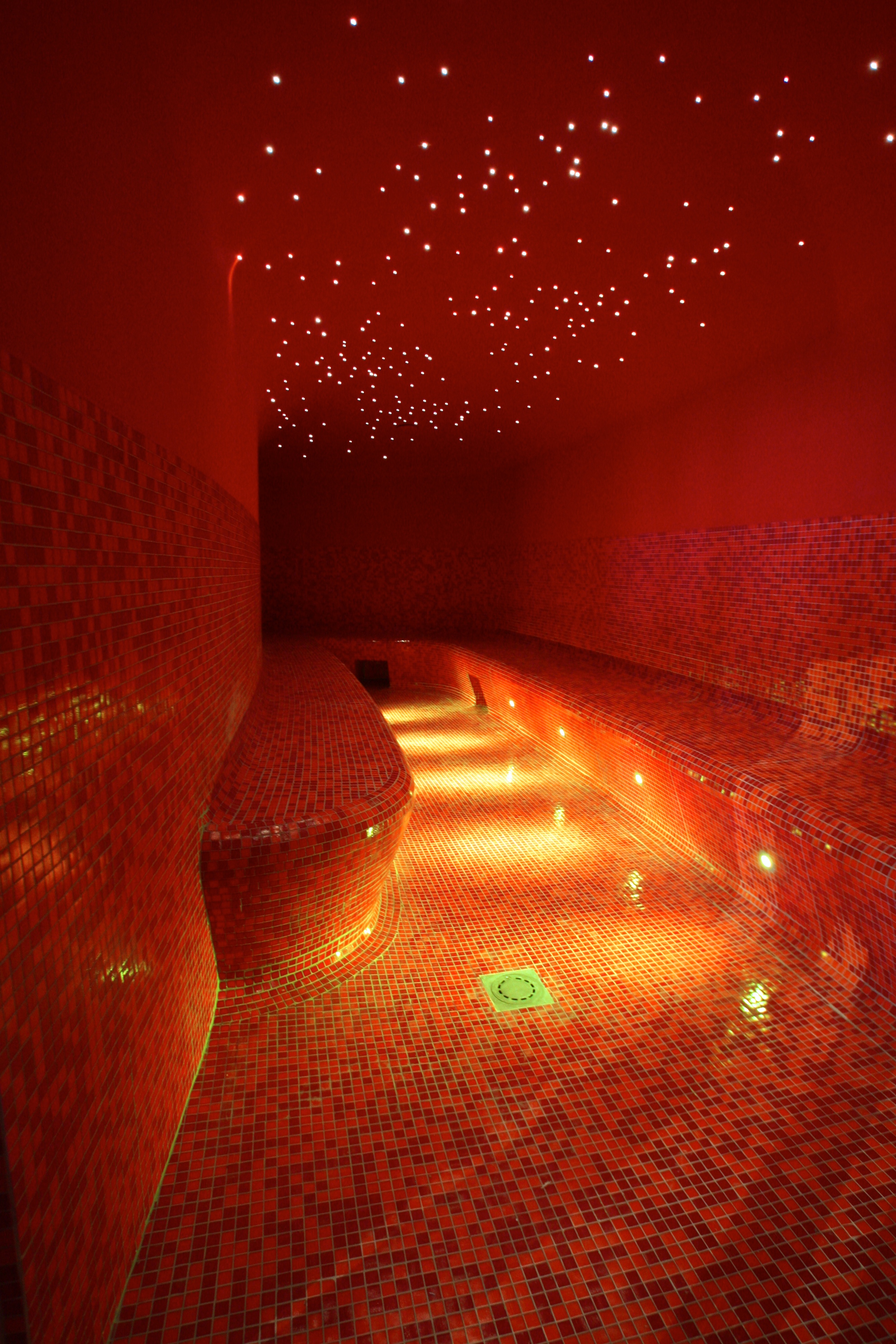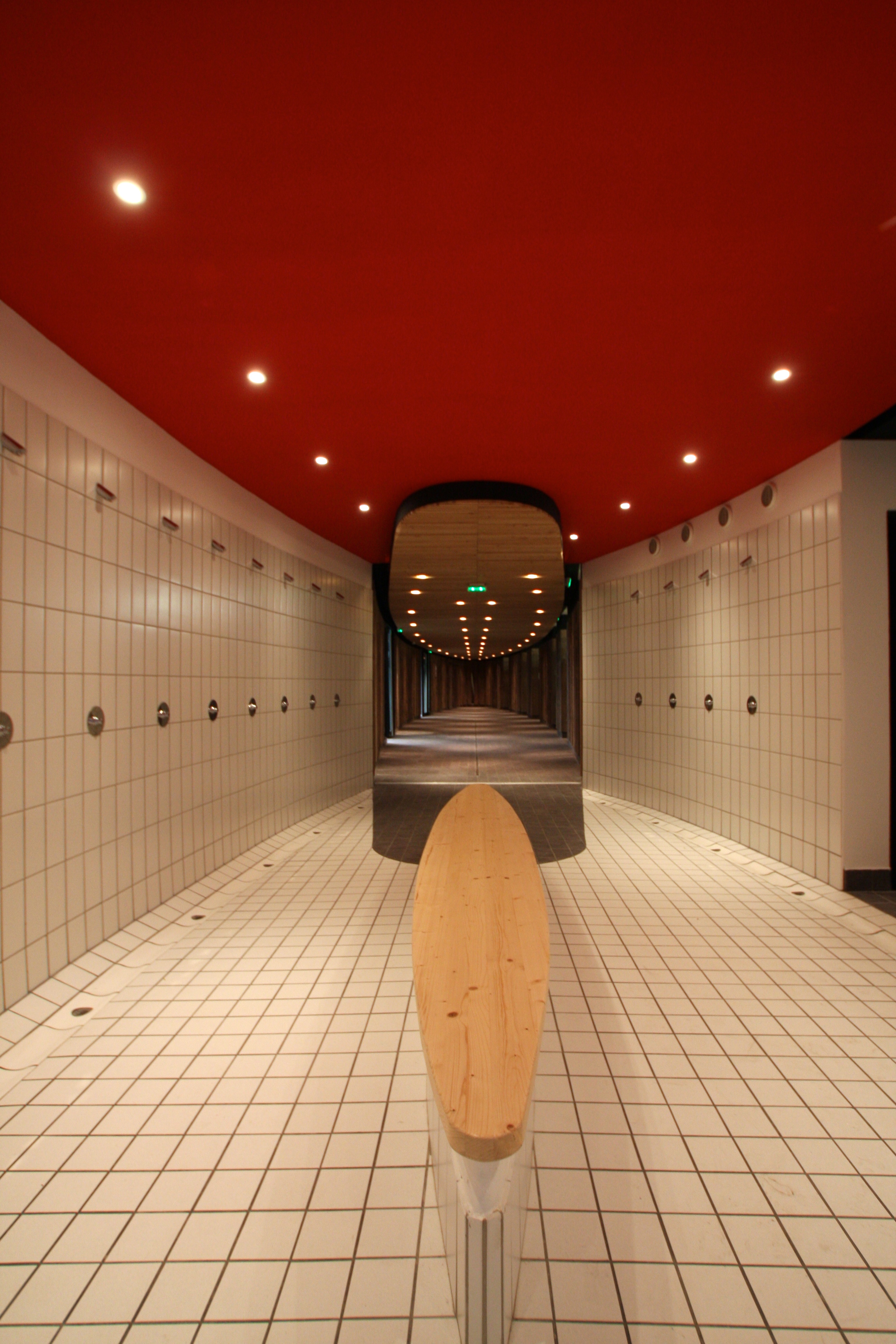 Accueil général et espaces aquatiques sont situés au rez-de-chaussée. Tout comme la balnéo, lovée à l’intérieur de la halle aquatique : ses formes souples, sa plage en bois et l’originalité des saunas dont les boîtes sortent en saillie dans le volume des bassins, confèrent à ce lieu de détente, protégé derrière sa cloison vitrée, un caractère intime et un parfum d’exclusif.