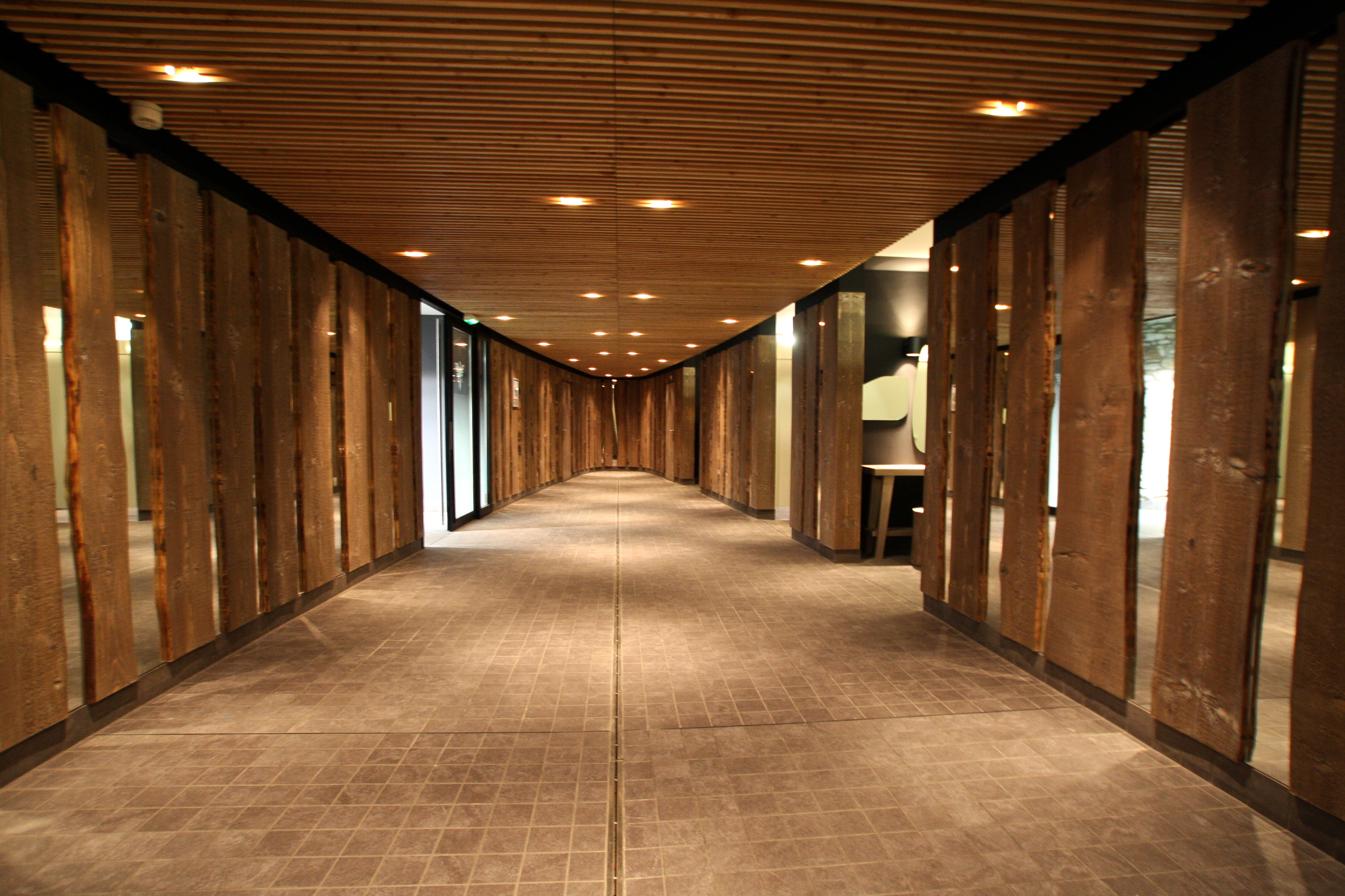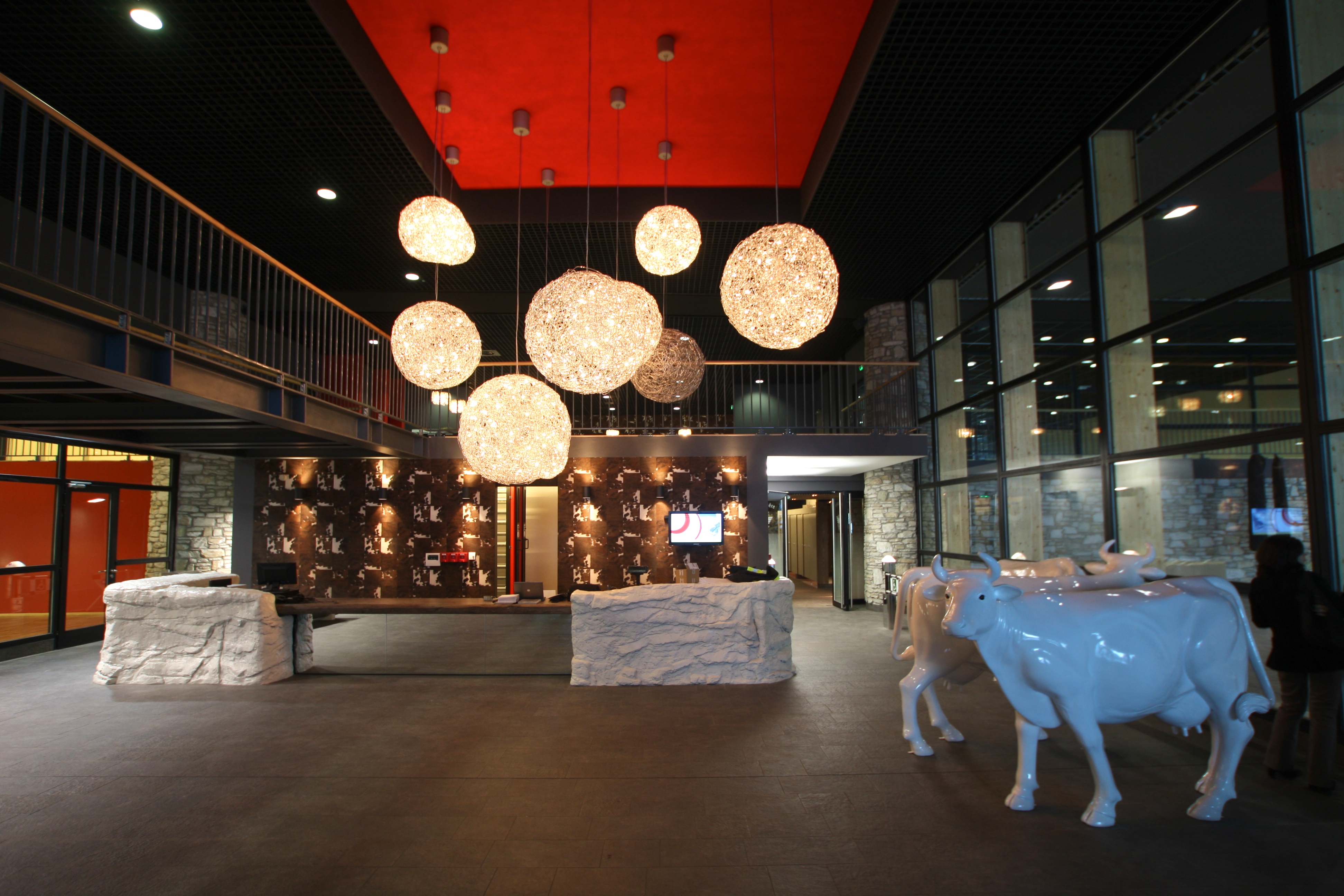 Son unique façade, orientée à l’Est, est largement ouverte sur le panorama grandiose d’où émergent les montagnes voisines du Dôme et de la Tsanteleina. Grâce à son immense surface vitrée toute de transparence, intérieur et extérieur ne font qu’un. L’ensemble est linéaire, sans rupture aucune et la sensation de fusion entre bâti et environnement s’en trouve renforcée.Un lieu fonctionnel et ludique Ouverte, lisible et didactique, l’organisation intérieure du bâtiment permet à l’usager de s’orienter aisément et de se diriger « à vue » sans recours systématique à la signalétique, ce qui est bien plus agréable pour une clientèle majoritairement étrangère.