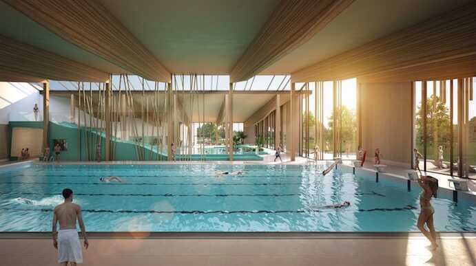 Programme Un bassin sportif 25m x 15m (6 couloirs homologués) 375 m2 - un bassin d’apprentissage 270 m2 - bassin d’apprentissage jeunes enfants 70 m2 - pentagliss 3 couloirs 100 m2 - gradins 200 places - Espace remise en forme avec sauna, hammam, jacuzzi, bassin d’activités et d’agrément 120 m2, salle de sport 180 m2, plages minérales