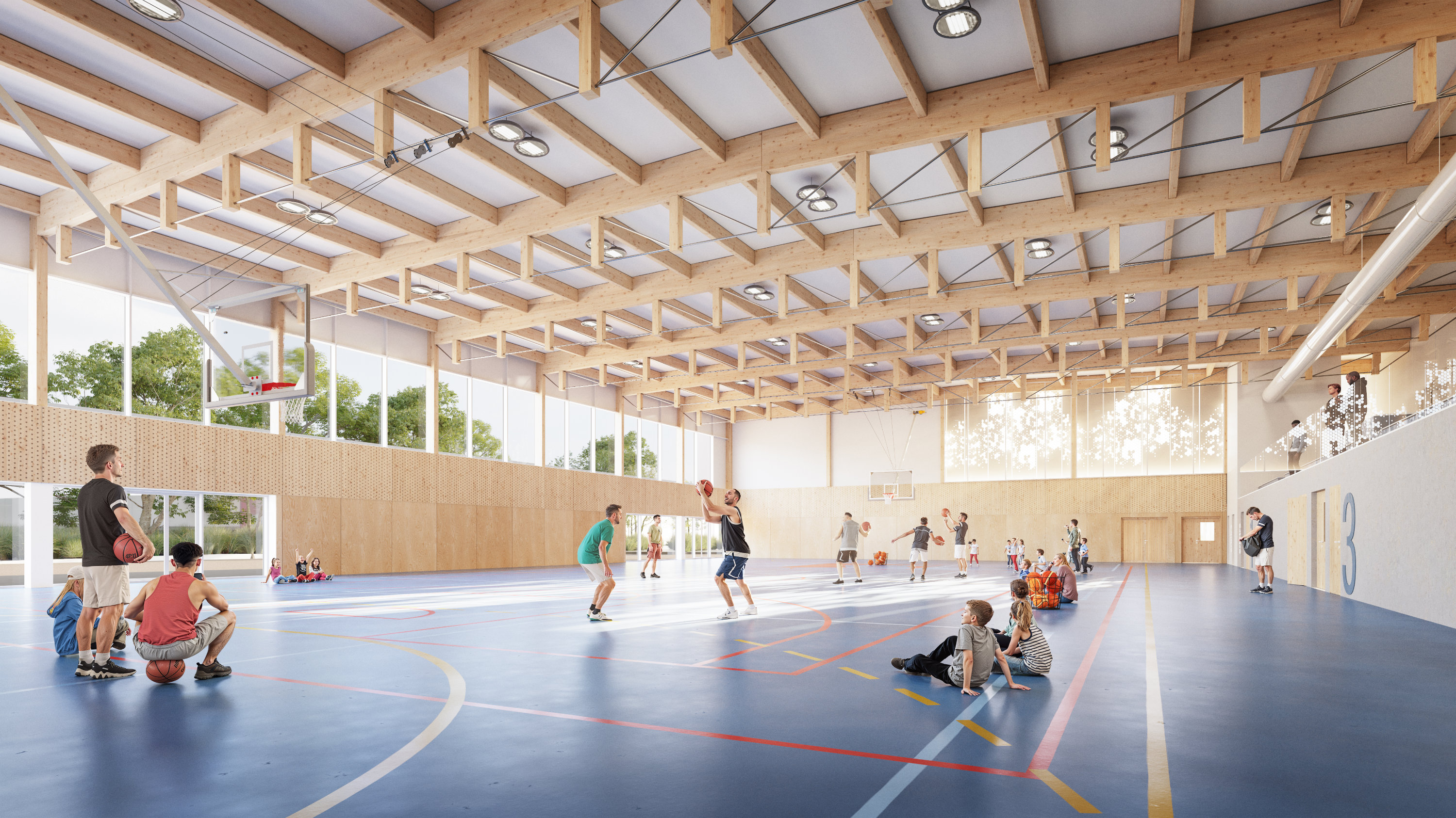 La salle omnisports s’ouvre au Sud, protégée par un débord maîtrisé.