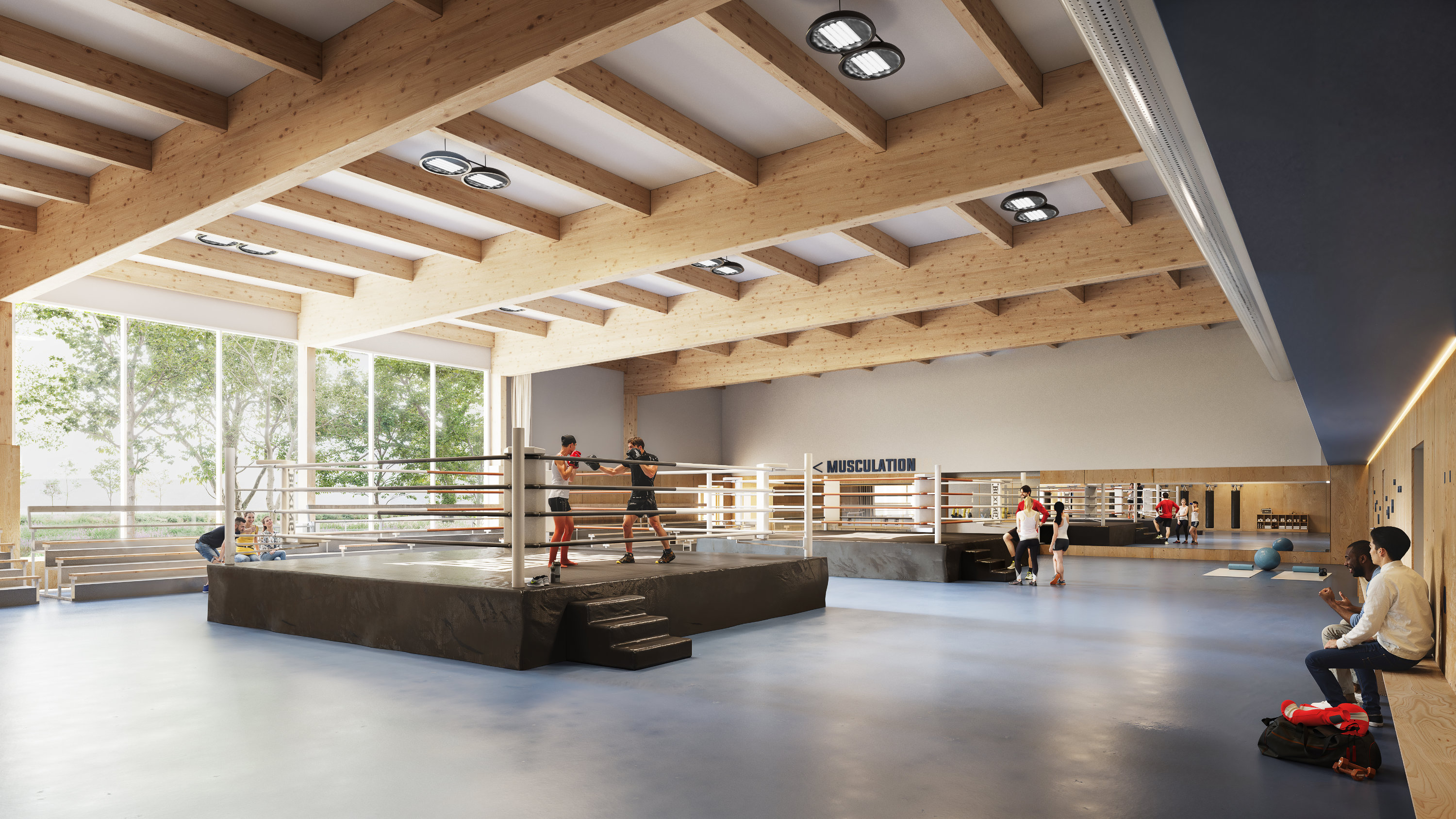 La salle de boxe dialogue avec les arbres existants au Nord.