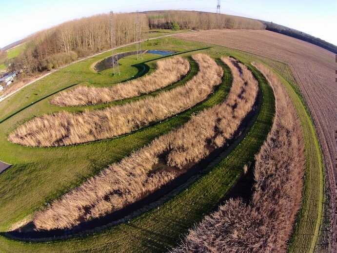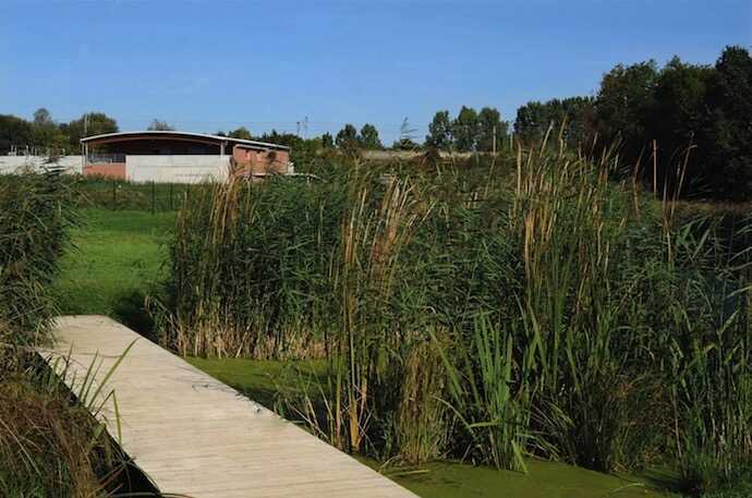 3. Le parcours de la biodiversité. Le départ de la visite est situé à la croisée de l’eau et de la terre, entre bâtiment et Jardins Filtrants®. Il est matérialisé par un abri qui fait le lien entre les jardins et le bâtiment. Le parcours permet d’expliquer le cheminement de l’eau tout au long de son traitement jusqu’au milieu récepteur à travers les jardins. Le visiteur est ainsi sensibilisé à l’importance de la qualité de l’eau et son impact sur la biodiversité. Des allées permettent au visiteur de cheminer dans les Jardins Filtrants® boues et air afin d’observer le processus de traitement et la reconstitution d’habitats écologiques (refuge pour les poissons, grenouilles, libellules...).