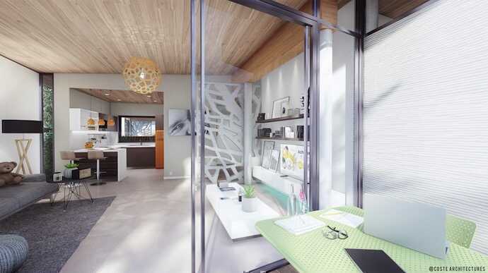 Ces modules réalisés « hors-site » permettront des gains de délais, de performances et de qualité. Au sud de ces modules se déploieront des murs en béton imprimés 3D, réalisés avec des formes plus libres, courbes, en partenariat avec la start-up XtreeE et le groupe Vicat. Ces murs composent le séjour et les chambres et seront reliés aux modules grâce à des menuiseries vitrées créant des failles lumineuses avec connexions visuelles.
