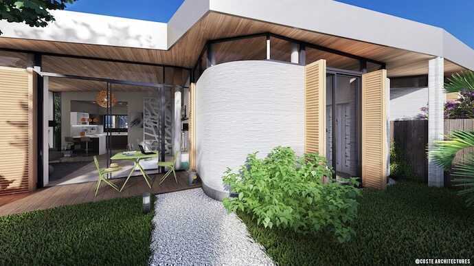 « Nous nous sommes inspirés de deux systèmes constructifs non conventionnels et innovants pour définir les grandes lignes architecturales du projet : l’impression 3D d’une part, pour la plupart des murs des maisons, innovation puissante permettant la réalisation de lignes courbes, complétée par des modules construits hors-site pour les blocs fonctionnels des maisons d’autre part », explique Emmanuel Coste de l’Agence Coste Architectures.